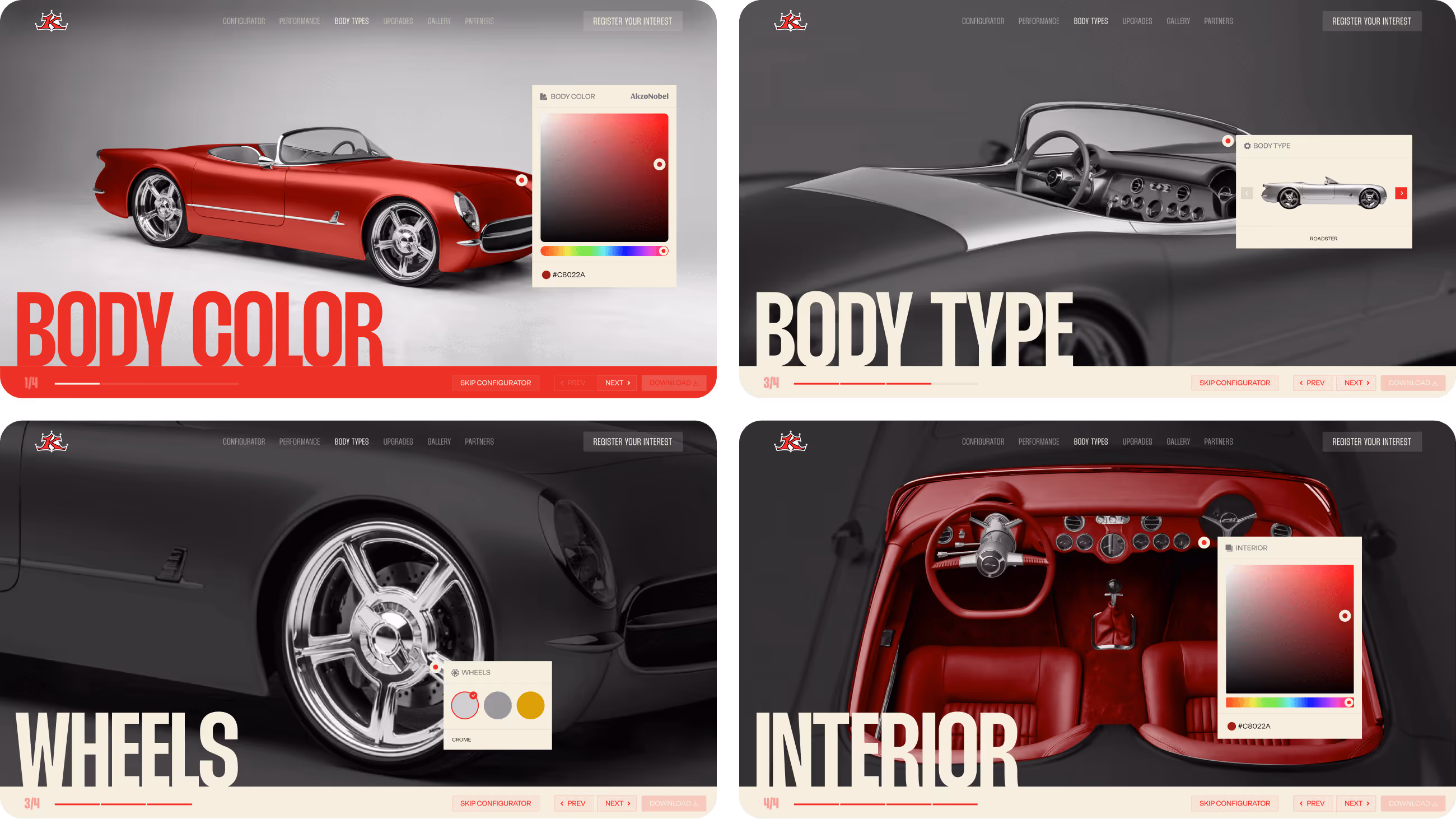 As Bitchin’ Rides wraps its final season, Kindig-It Design is shifting focus to the CF1, their first fully in-house, hand-built vehicle inspired by the 1953 Chevrolet Corvette. We partnered with them to design a landing page that doubles as a configurator, allowing users to visualize and customize their own CF1 with stunning detail.